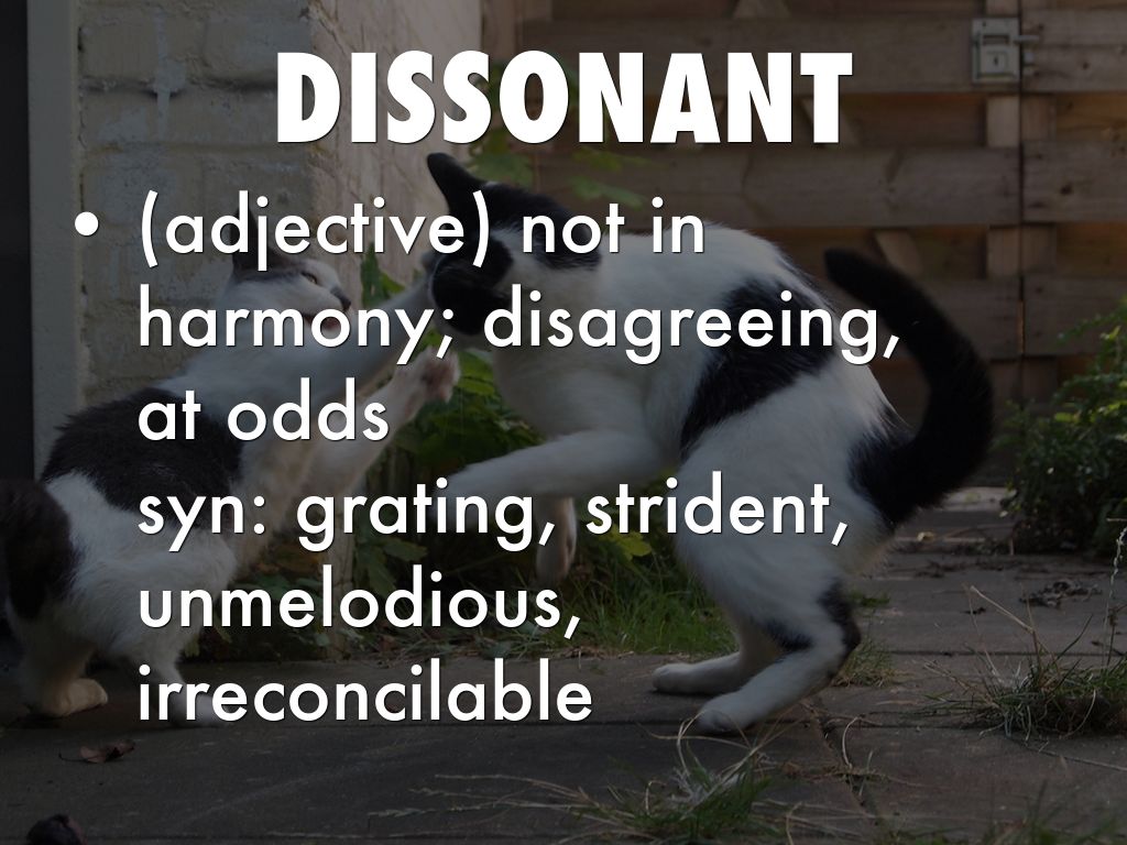 (adjective) not in harmony; disagreeing, at odds syn: grating, strident, unmelodious, irreconcilable