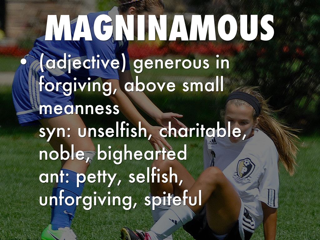 (adjective) generous in forgiving, above small meanness syn: unselfish, charitable, noble, bighearted ant: petty, selfish, unforgiving, spiteful