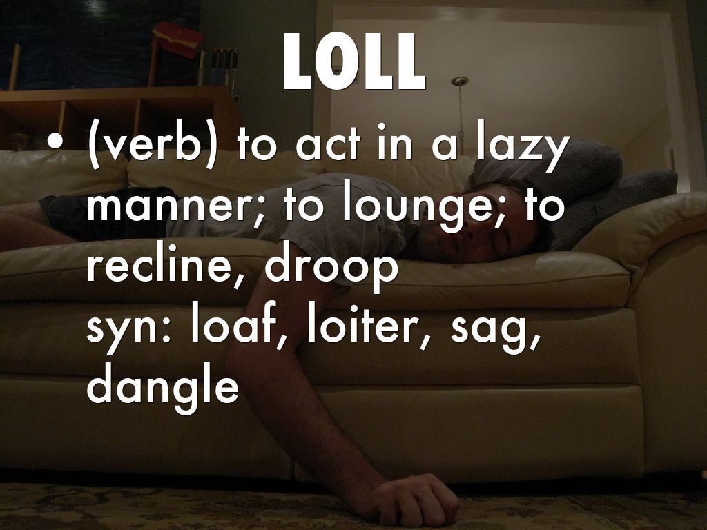 (verb) to act in a lazy manner; to lounge; to recline, droop syn: loaf, loiter, sag, dangle