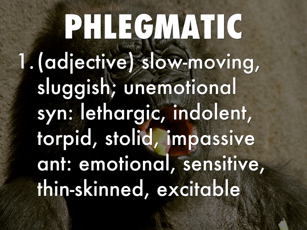(adjective) slow-moving, sluggish; unemotional syn: lethargic, indolent, torpid, stolid, impassive ant: emotional, sensitive, thin-skinned, excitable