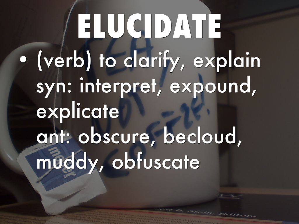 (verb) to clarify, explain syn: interpret, expound, explicate ant: obscure, becloud, muddy, obfuscate