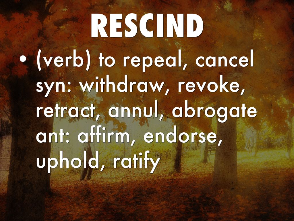 (verb) to repeal, cancel syn: withdraw, revoke, retract, annul, abrogate ant: affirm, endorse, uphold, ratify