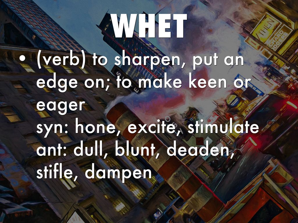 (verb) to sharpen, put an edge on; to make keen or eager syn: hone, excite, stimulate ant: dull, blunt, deaden, stifle, dampen