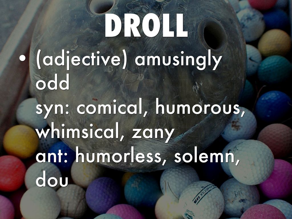 (adjective) amusingly odd syn: comical, humorous, whimsical, zany ant: humorless, solemn, dou