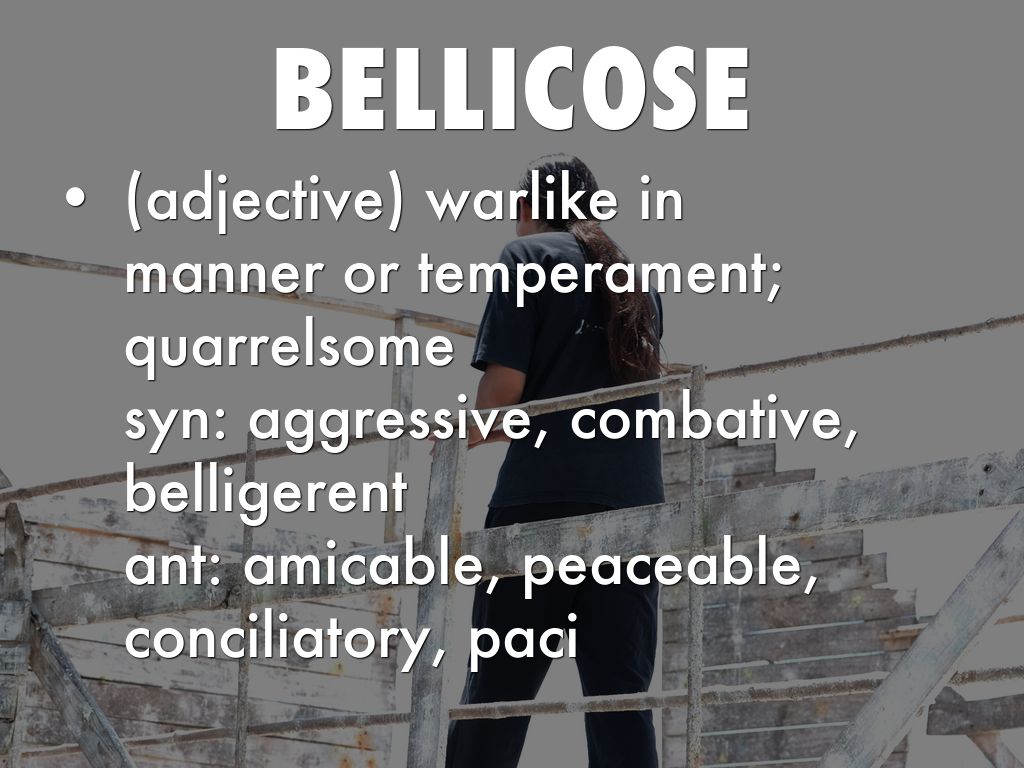 (adjective) warlike in manner or temperament; quarrelsome syn: aggressive, combative, belligerent ant: amicable, peaceable, conciliatory, paci