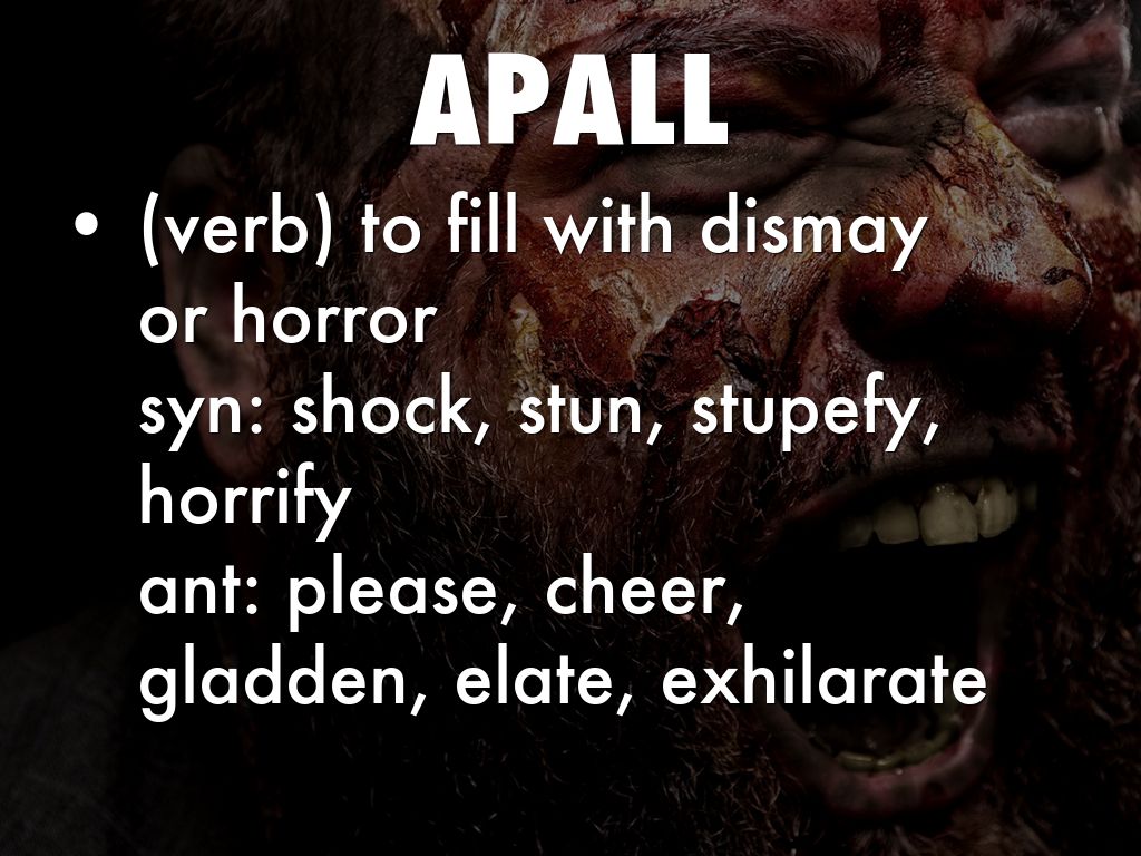 (verb) to fill with dismay or horror syn: shock, stun, stupefy, horrify ant: please, cheer, gladden, elate, exhilarate