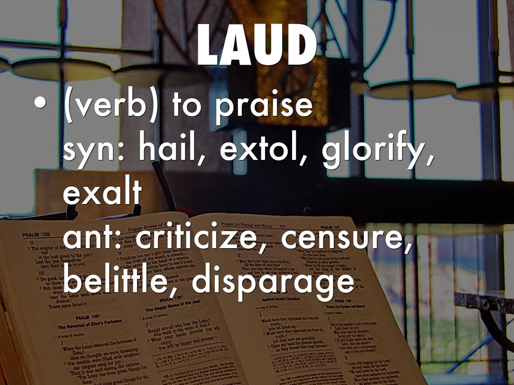 (verb) to praise syn: hail, extol, glorify, exalt ant: criticize, censure, belittle, disparage