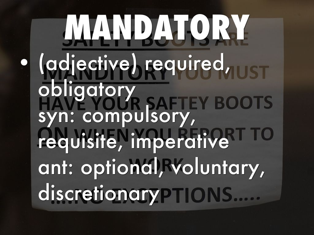 (adjective) required, obligatory syn: compulsory, requisite, imperative ant: optional, voluntary, discretionary