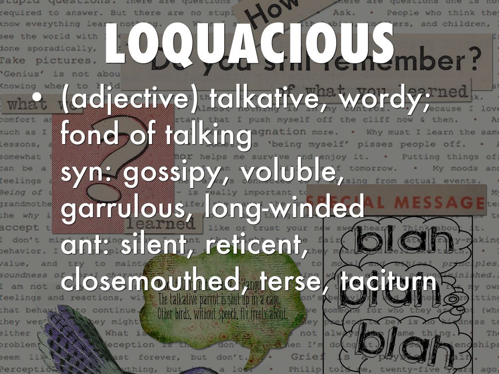 (adjective) talkative, wordy; fond of talking syn: gossipy, voluble, garrulous, long-winded ant: silent, reticent, closemouthed, terse, taciturn