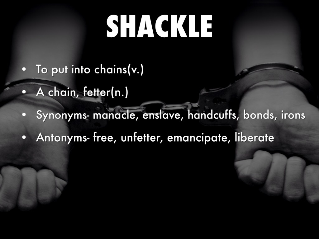 Synonyms- manacle, enslave, handcuffs, bonds, irons