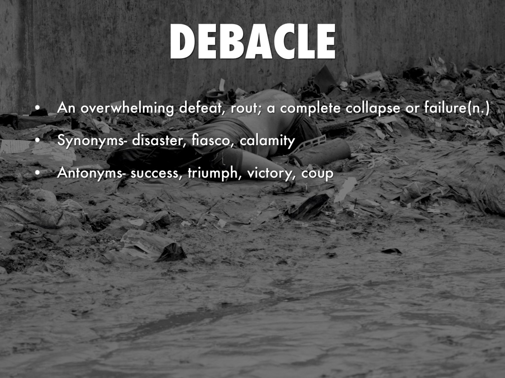 An overwhelming defeat, rout; a complete collapse or failure(n.)