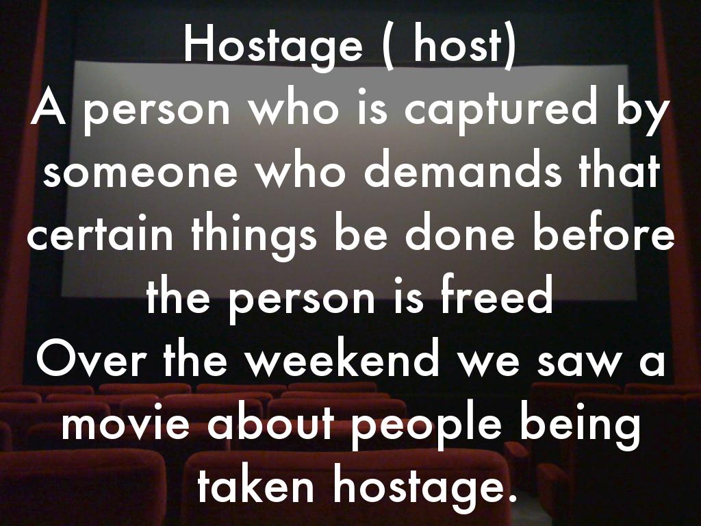Hostage ( host) A person who is captured by someone who demands that certain things be done before the person is freed Over the weekend we saw a movie about people being taken hostage.