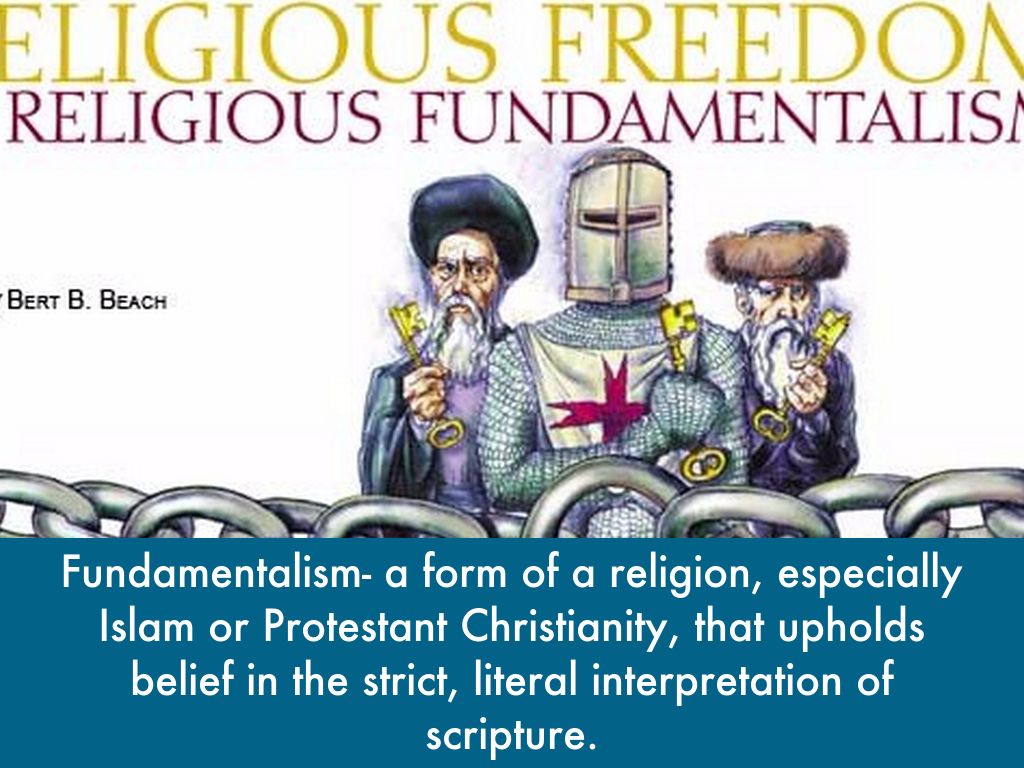 Fundamentalism- a form of a religion, especially Islam or Protestant Christianity, that upholds belief in the strict, literal interpretation of scripture.