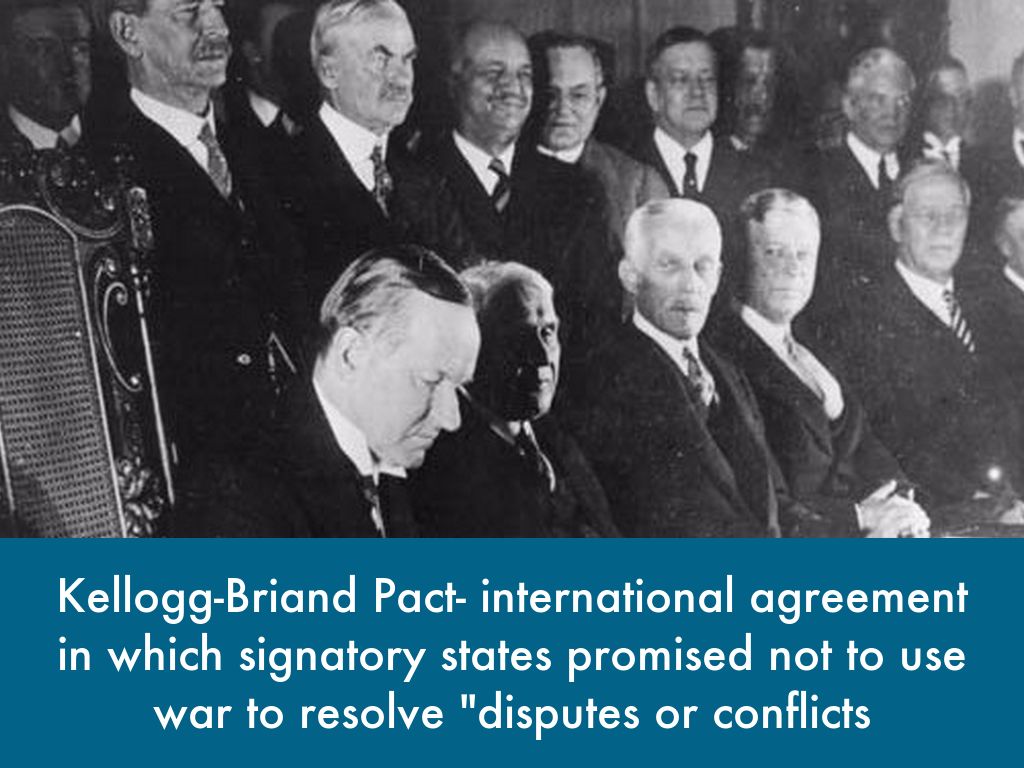 Kellogg-Briand Pact- international agreement in which signatory states promised not to use war to resolve "disputes or conflicts