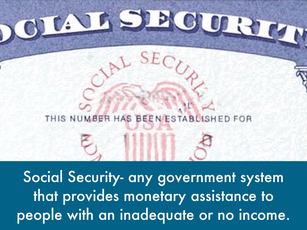 Social Security- any government system that provides monetary assistance to people with an inadequate or no income.
