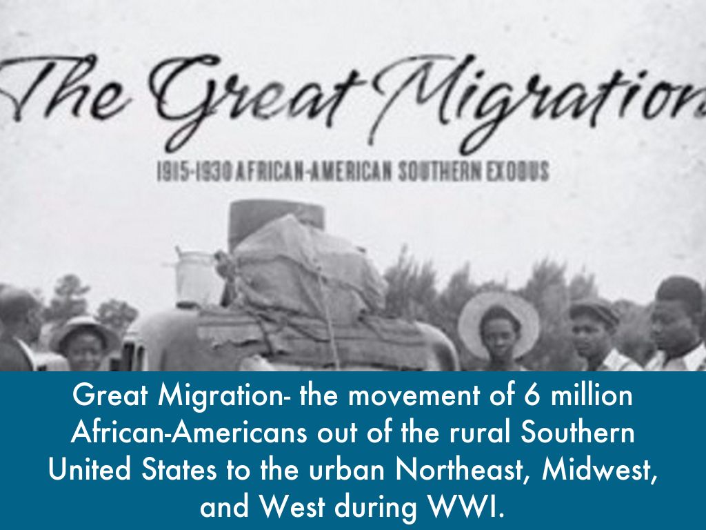 Great Migration- the movement of 6 million African-Americans out of the rural Southern United States to the urban Northeast, Midwest, and West during WWI.