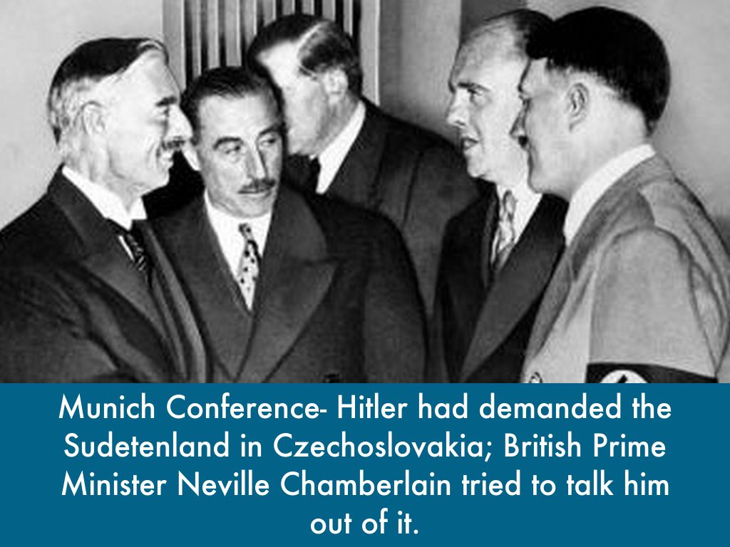 Munich Conference- Hitler had demanded the Sudetenland in Czechoslovakia; British Prime Minister Neville Chamberlain tried to talk him out of it.