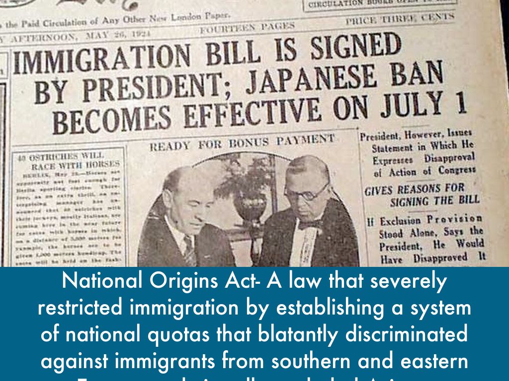 National Origins Act- A law that severely restricted immigration by establishing a system of national quotas that blatantly discriminated against immigrants from southern and eastern Europe and virtually excluded Asians.