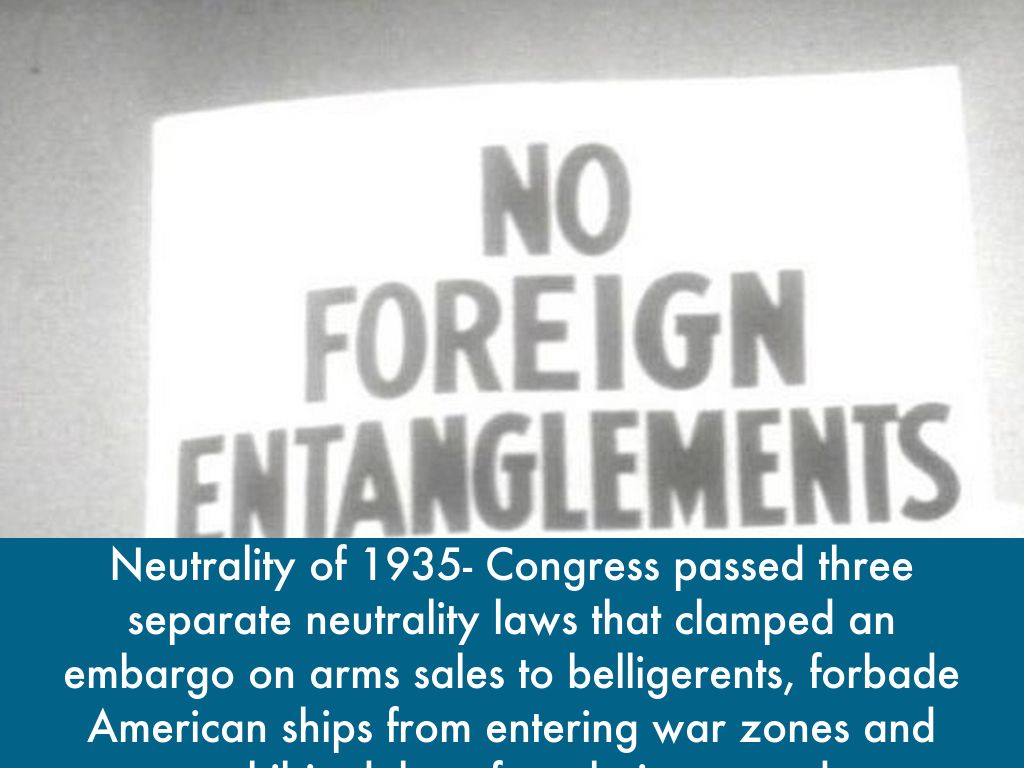 Neutrality of 1935- Congress passed three separate neutrality laws that clamped an embargo on arms sales to belligerents, forbade American ships from entering war zones and prohibited them from being armed.