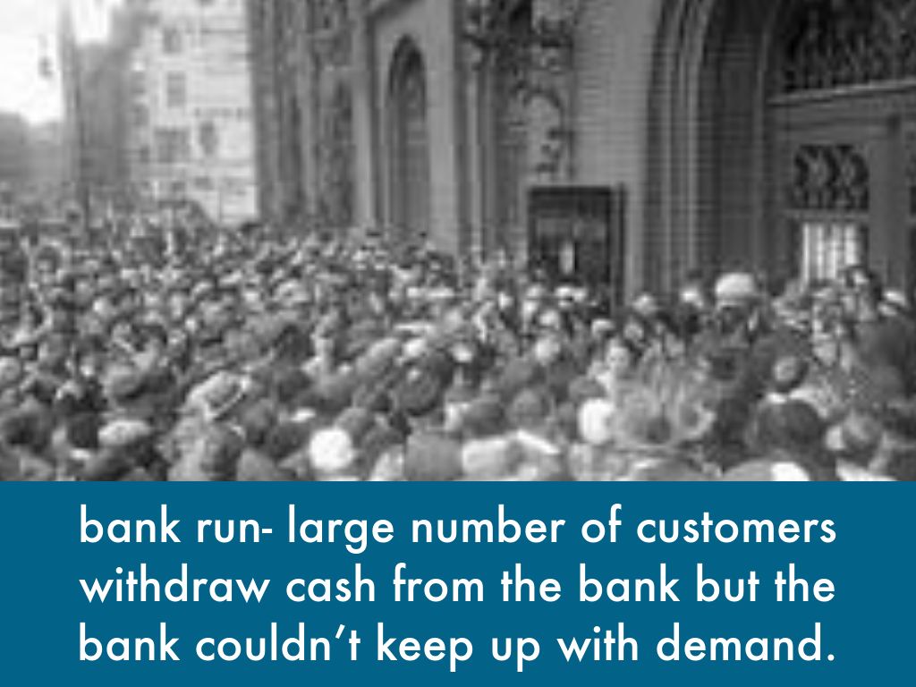 bank run- large number of customers withdraw cash from the bank but the bank couldn’t keep up with demand.