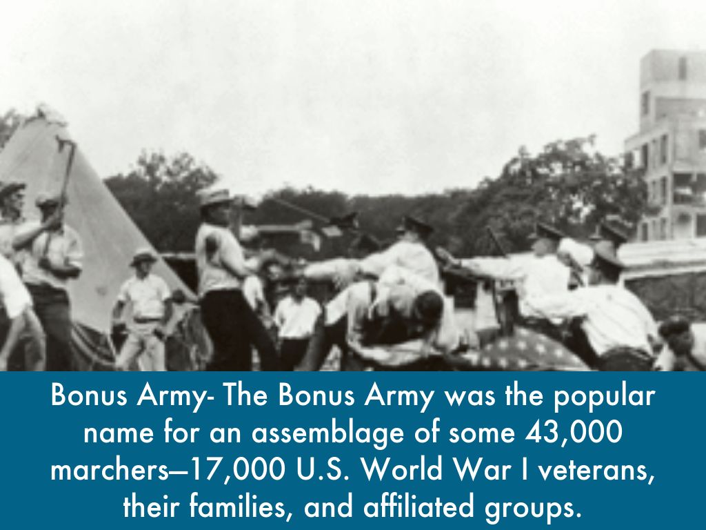 Bonus Army- The Bonus Army was the popular name for an assemblage of some 43,000 marchers—17,000 U.S. World War I veterans, their families, and affiliated groups.