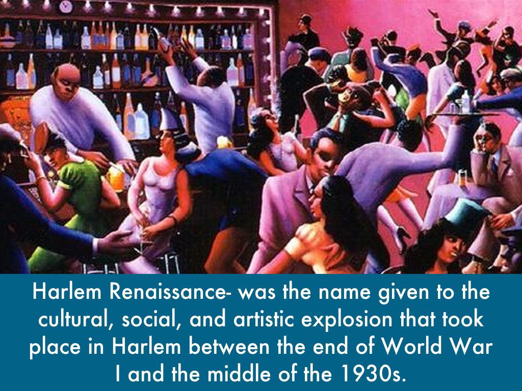 Harlem Renaissance- was the name given to the cultural, social, and artistic explosion that took place in Harlem between the end of World War I and the middle of the 1930s.