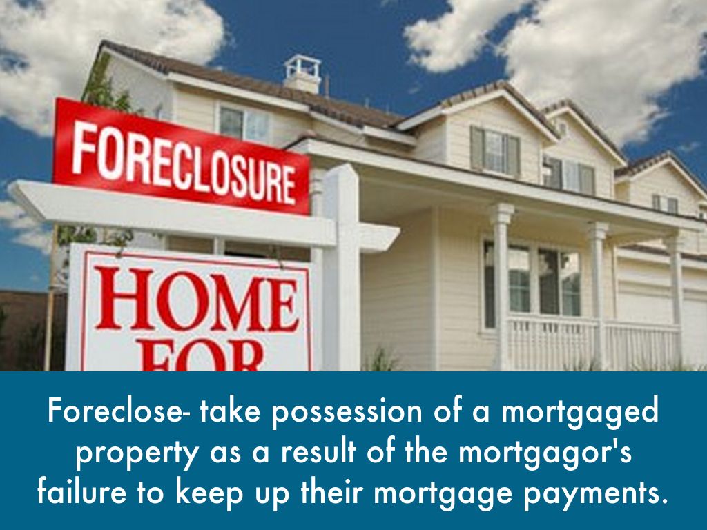 Foreclose- take possession of a mortgaged property as a result of the mortgagor's failure to keep up their mortgage payments.