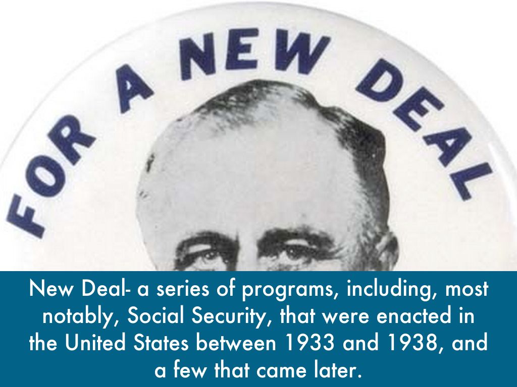 New Deal- a series of programs, including, most notably, Social Security, that were enacted in the United States between 1933 and 1938, and a few that came later.
