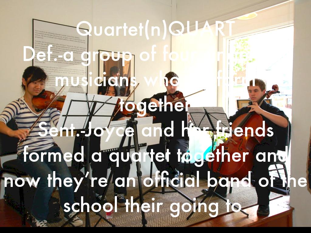 Quartet(n)QUART Def.-a group of four singers or musicians who perform together Sent.-Joyce and her friends formed a quartet together and now they’re an official band of the school their going to.