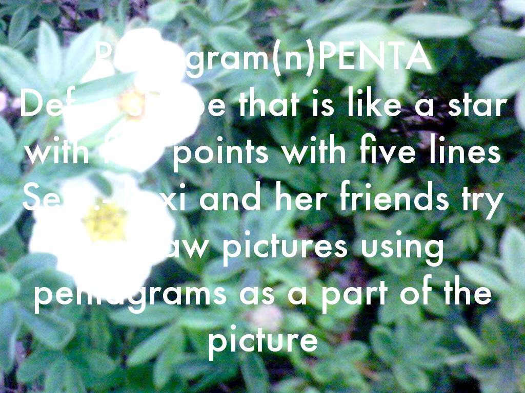 Pentagram(n)PENTA Def.-a shape that is like a star with five points with five lines Sent.- Lexi and her friends try to draw pictures using pentagrams as a part of the picture