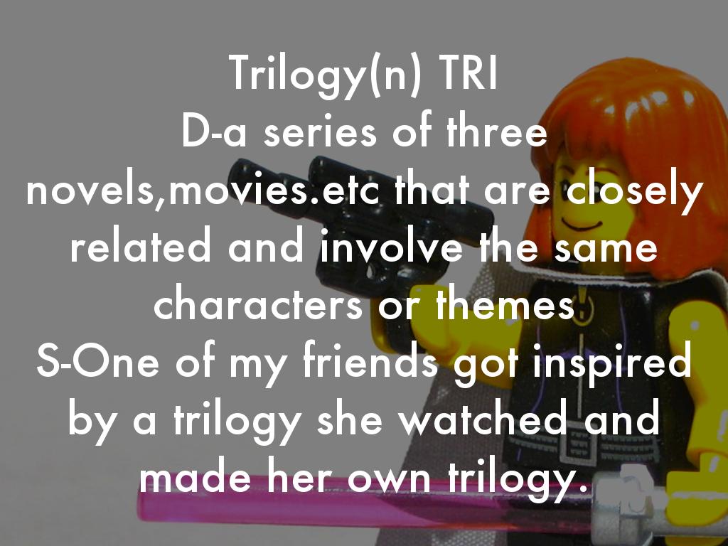 Trilogy(n) TRI D-a series of three novels,movies.etc that are closely related and involve the same characters or themes S-One of my friends got inspired by a trilogy she watched and made her own trilogy.