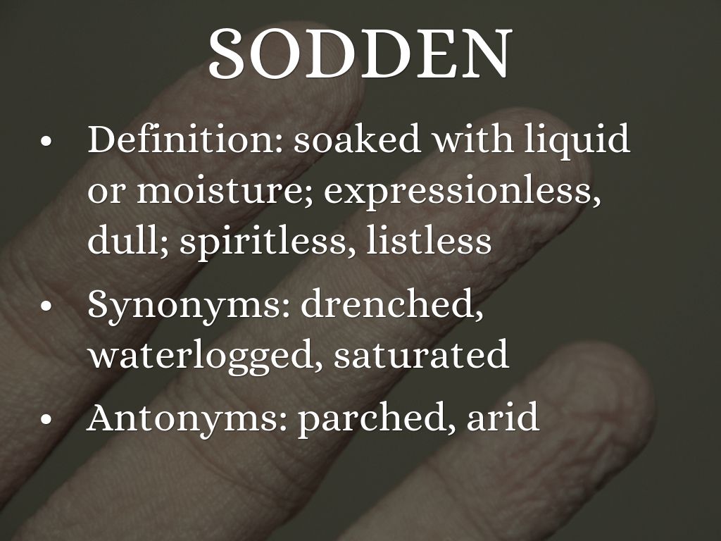 Definition: soaked with liquid or moisture; expressionless, dull; spiritless, listless