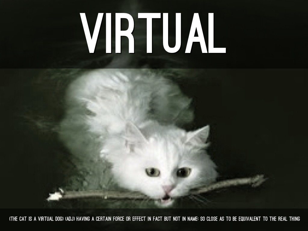 (tHE CAT IS A VIRTUAL DOG) (ADJ) HAVING A CERTAIN FORCE OR EFFECT IN FACT BUT NOT IN NAME; SO CLOSE AS TO BE EQUIVALENT TO THE REAL THING