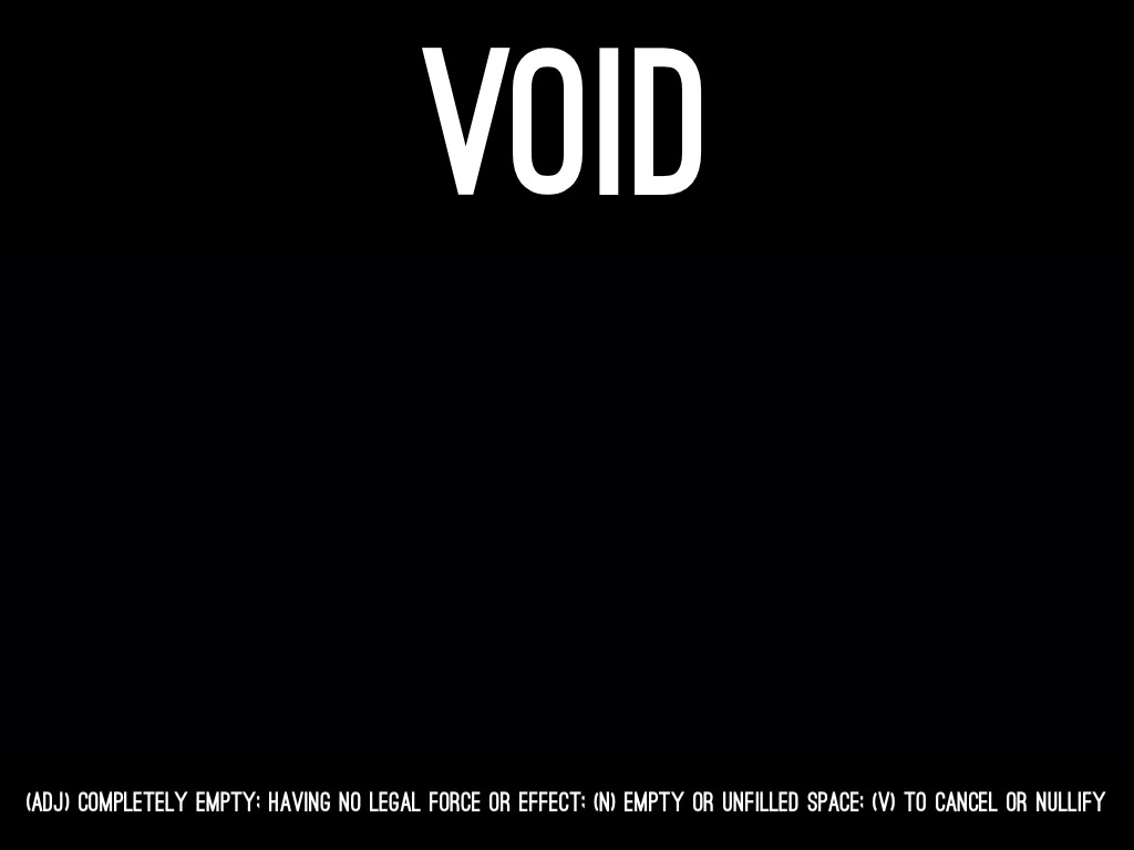 (ADJ) COMPLETELY EMPTY; HAVING NO LEGAL FORCE OR EFFECT; (N) EMPTY OR UNFILLED SPACE; (V) TO CANCEL OR NULLIFY