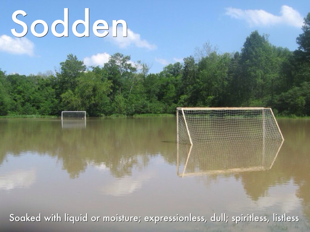 Soaked with liquid or moisture; expressionless, dull; spiritless, listless