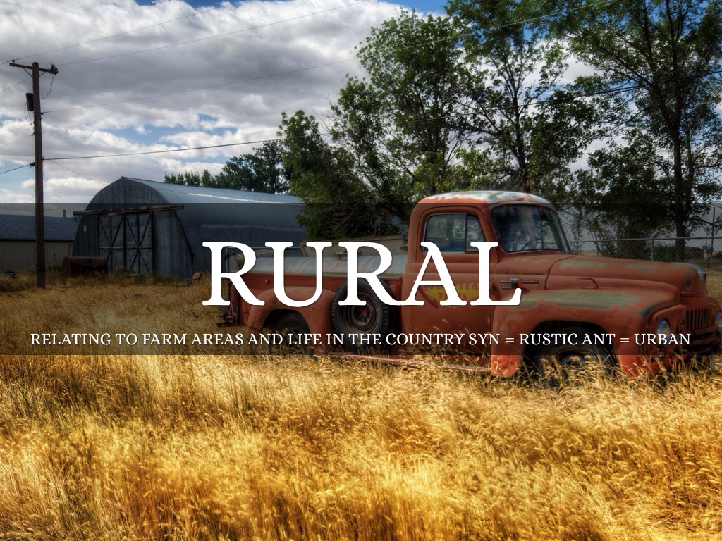 RELATING TO FARM AREAS AND LIFE IN THE COUNTRY SYN = RUSTIC ANT = URBAN