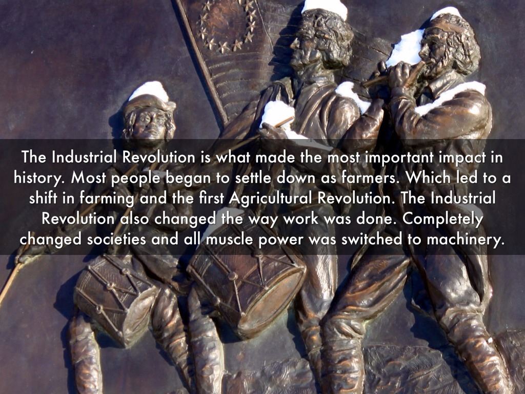 The Industrial Revolution is what made the most important impact in history. Most people began to settle down as farmers. Which led to a shift in farming and the first Agricultural Revolution. The Industrial Revolution also changed the way work was done. Completely changed societies and all muscle power was switched to machinery.