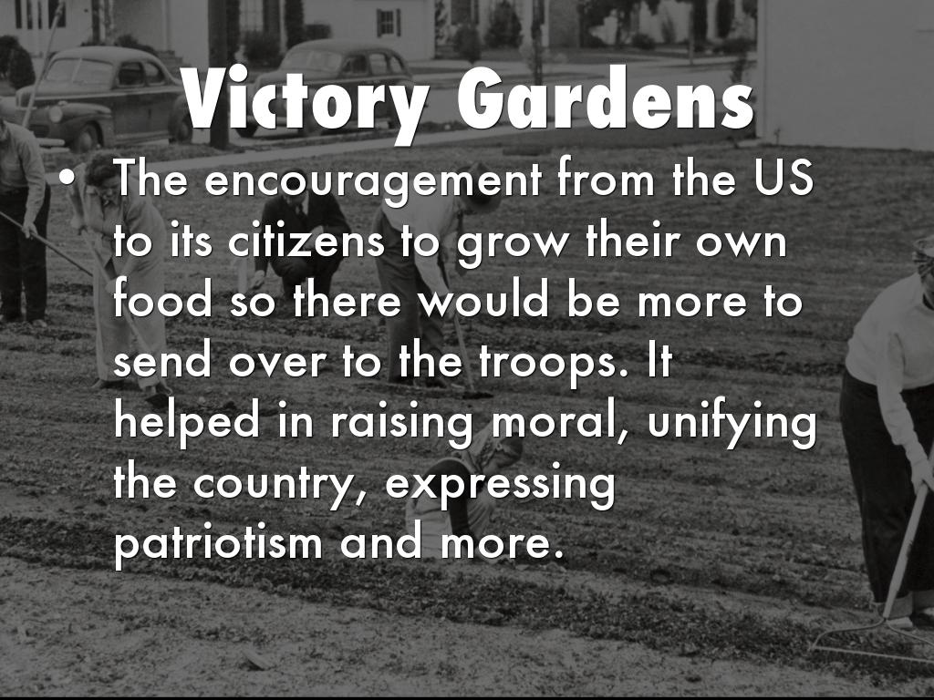 The encouragement from the US to its citizens to grow their own food so there would be more to send over to the troops. It helped in raising moral, unifying the country, expressing patriotism and more.