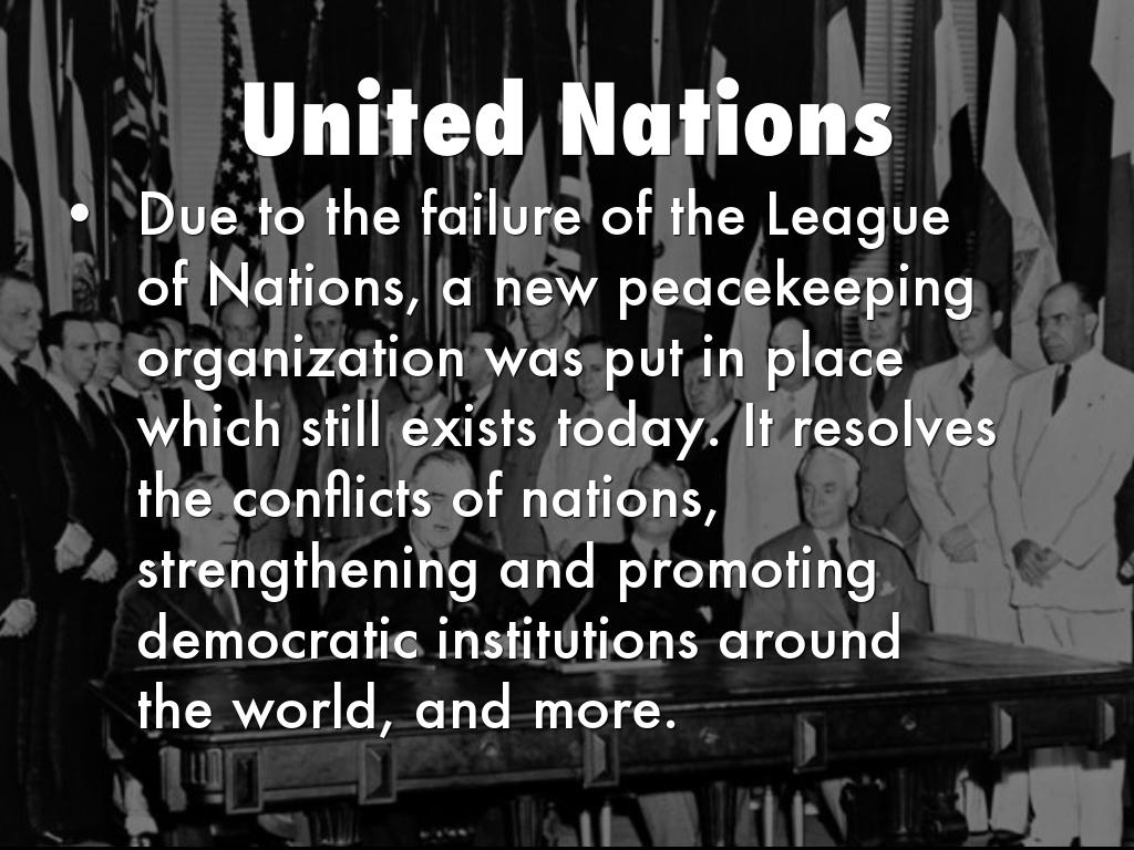 Due to the failure of the League of Nations, a new peacekeeping organization was put in place which still exists today. It resolves the conflicts of nations, strengthening and promoting democratic institutions around the world, and more.