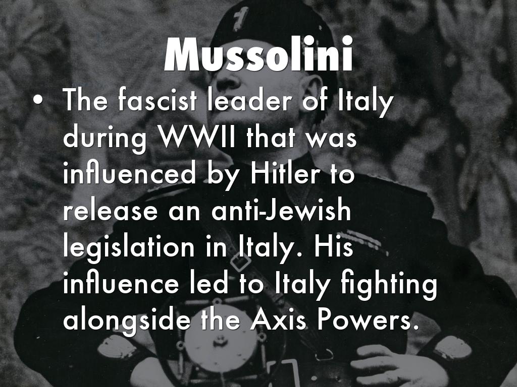 The fascist leader of Italy during WWII that was influenced by Hitler to release an anti-Jewish legislation in Italy. His influence led to Italy fighting alongside the Axis Powers.