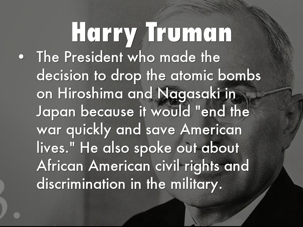 The President who made the decision to drop the atomic bombs on Hiroshima and Nagasaki in Japan because it would "end the war quickly and save American lives." He also spoke out about African American civil rights and discrimination in the military.