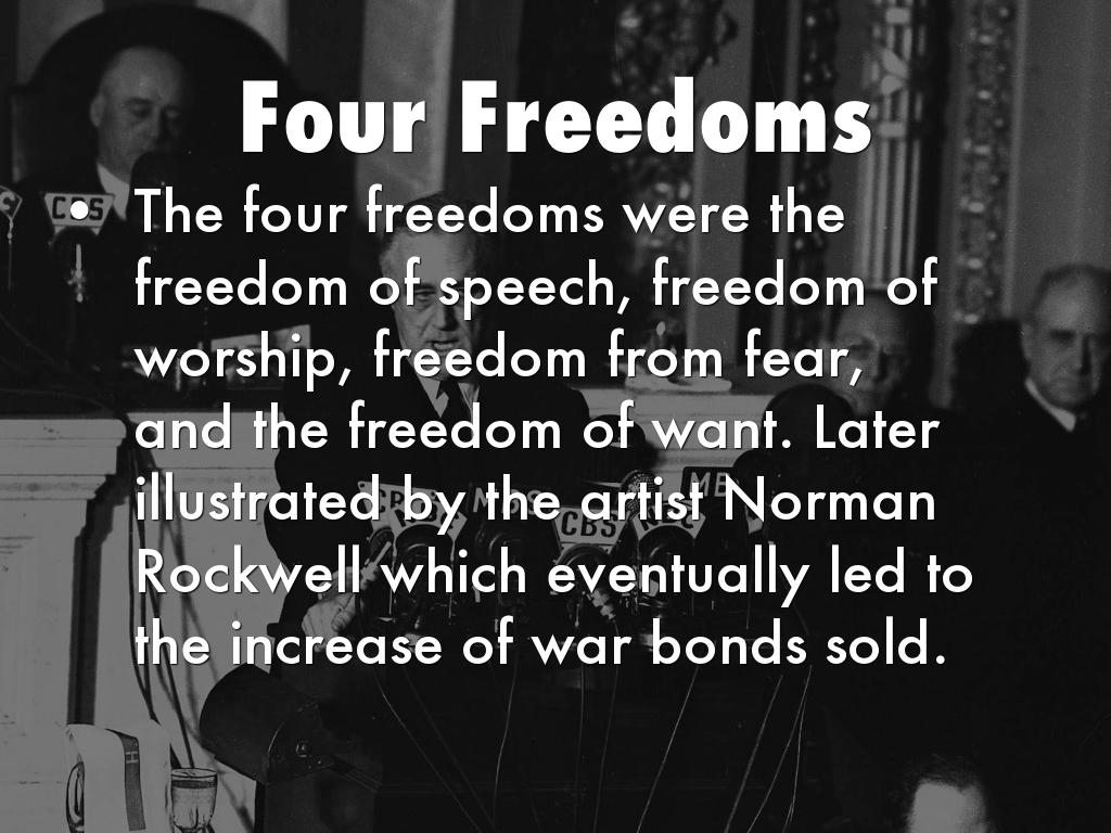 The four freedoms were the freedom of speech, freedom of worship, freedom from fear, and the freedom of want. Later illustrated by the artist Norman Rockwell which eventually led to the increase of war bonds sold.