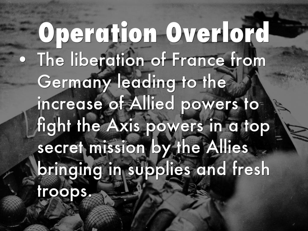 The liberation of France from Germany leading to the increase of Allied powers to fight the Axis powers in a top secret mission by the Allies bringing in supplies and fresh troops.