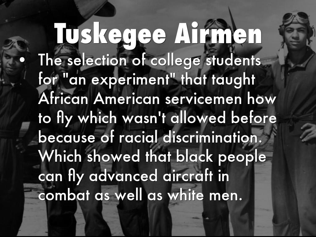 The selection of college students for "an experiment" that taught African American servicemen how to fly which wasn't allowed before because of racial discrimination. Which showed that black people can fly advanced aircraft in combat as well as white men.