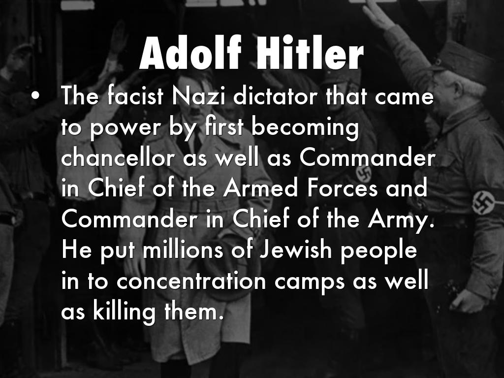 The facist Nazi dictator that came to power by first becoming chancellor as well as Commander in Chief of the Armed Forces and Commander in Chief of the Army. He put millions of Jewish people in to concentration camps as well as killing them.