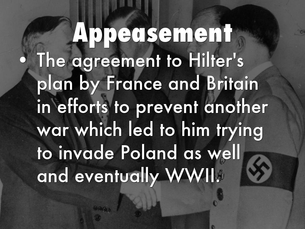 The agreement to Hilter's plan by France and Britain in efforts to prevent another war which led to him trying to invade Poland as well and eventually WWII.