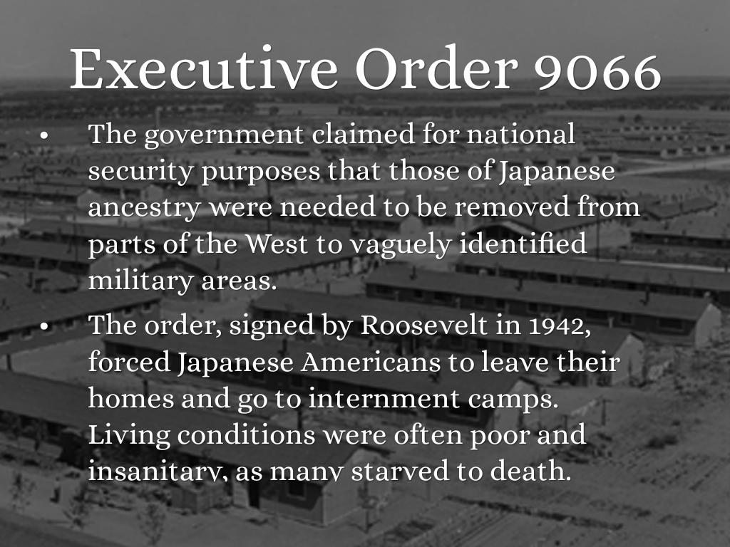 The order, signed by Roosevelt in 1942, forced Japanese Americans to leave their homes and go to internment camps. Living conditions were often poor and insanitary, as many starved to death.