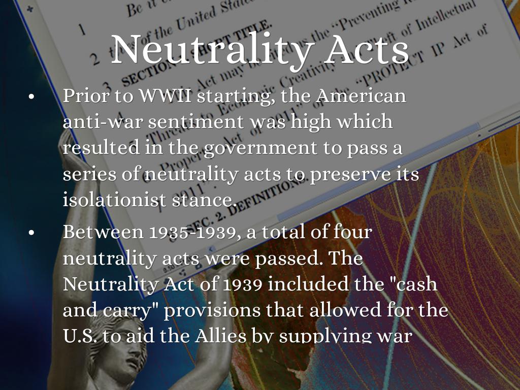 Between 1935-1939, a total of four neutrality acts were passed. The Neutrality Act of 1939 included the "cash and carry" provisions that allowed for the U.S. to aid the Allies by supplying war equipment.