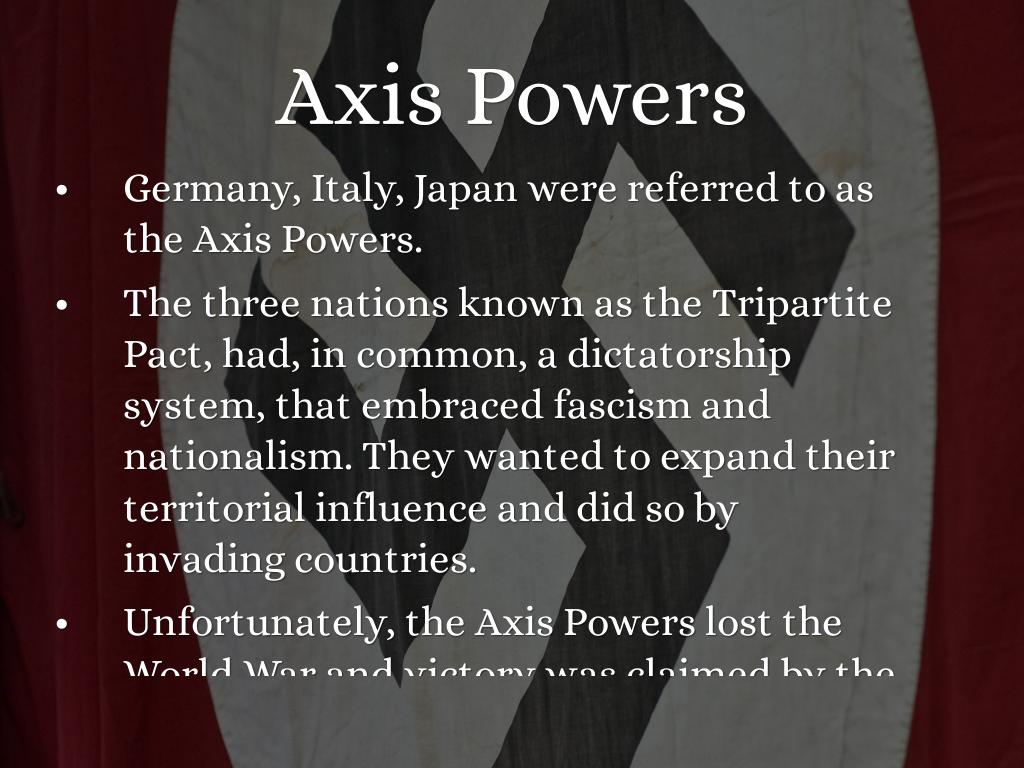 The three nations known as the Tripartite Pact, had, in common, a dictatorship system, that embraced fascism and nationalism. They wanted to expand their territorial influence and did so by invading countries.