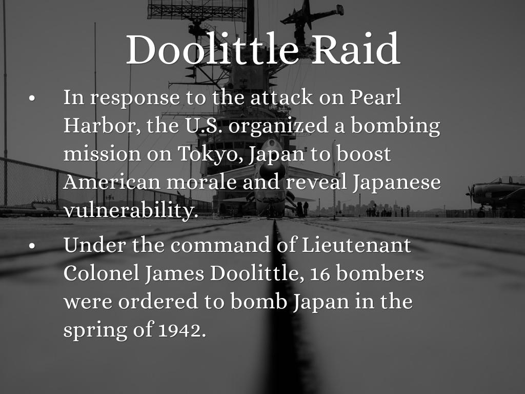 In response to the attack on Pearl Harbor, the U.S. organized a bombing mission on Tokyo, Japan to boost American morale and reveal Japanese vulnerability.